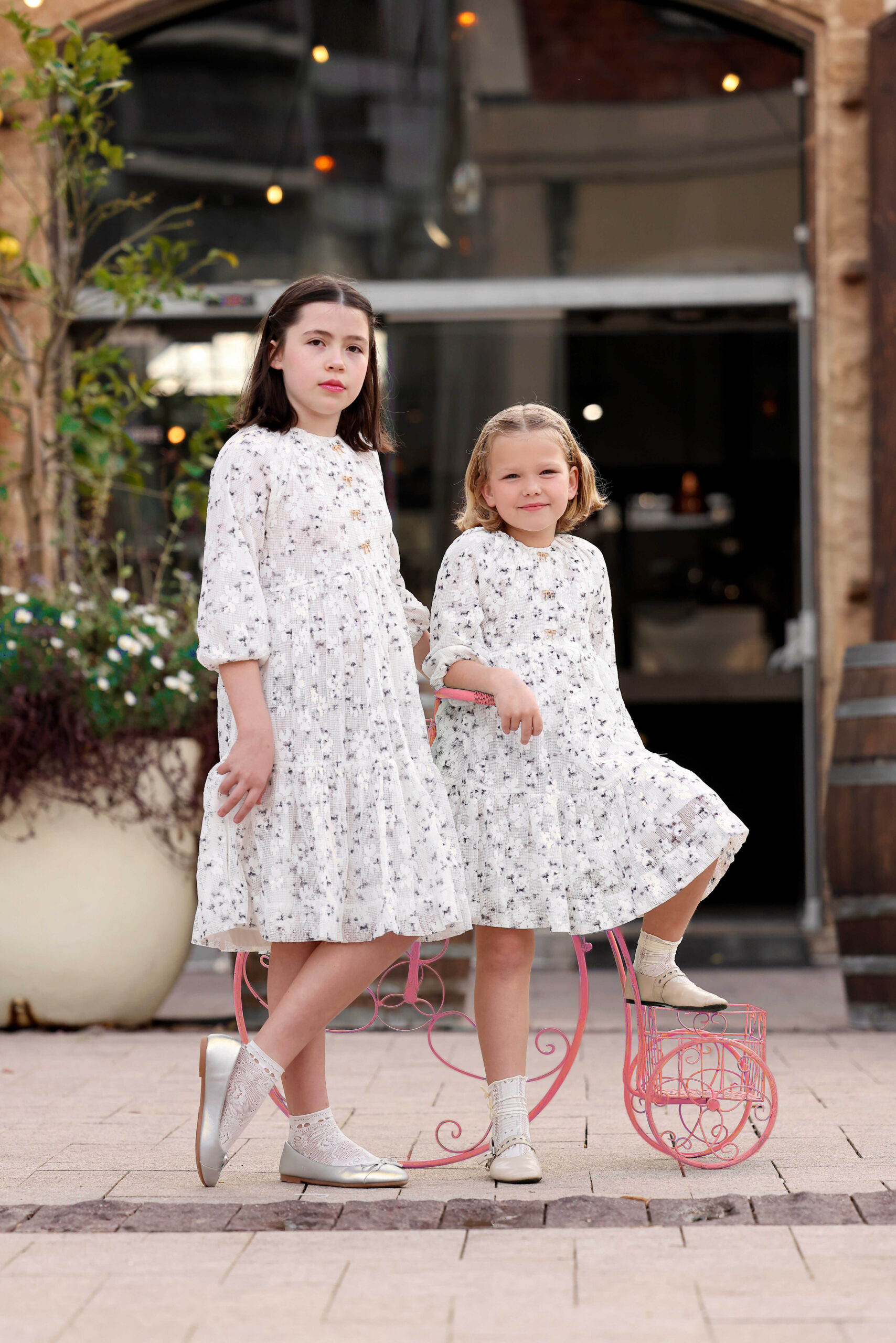 שמלת תחרה מושלמת עם הדפס פרחי מים מעודן, בגזרת קומות נשפכת עם פפיוני זהב קטנטנים